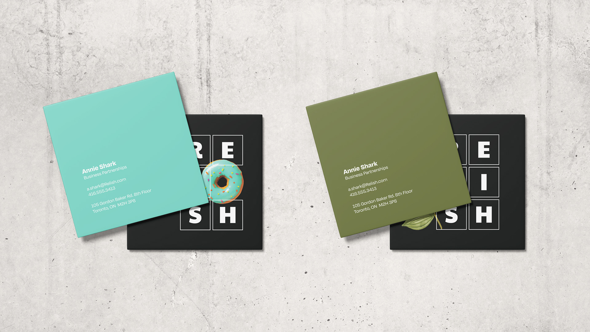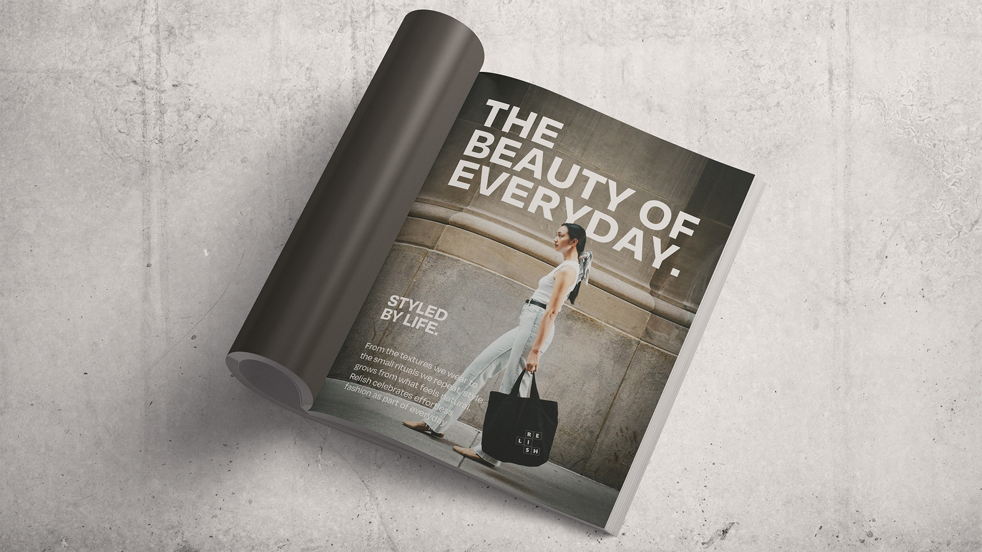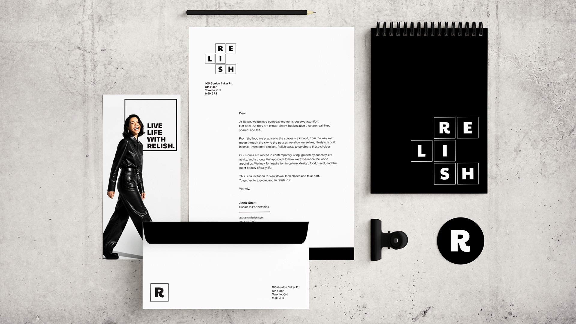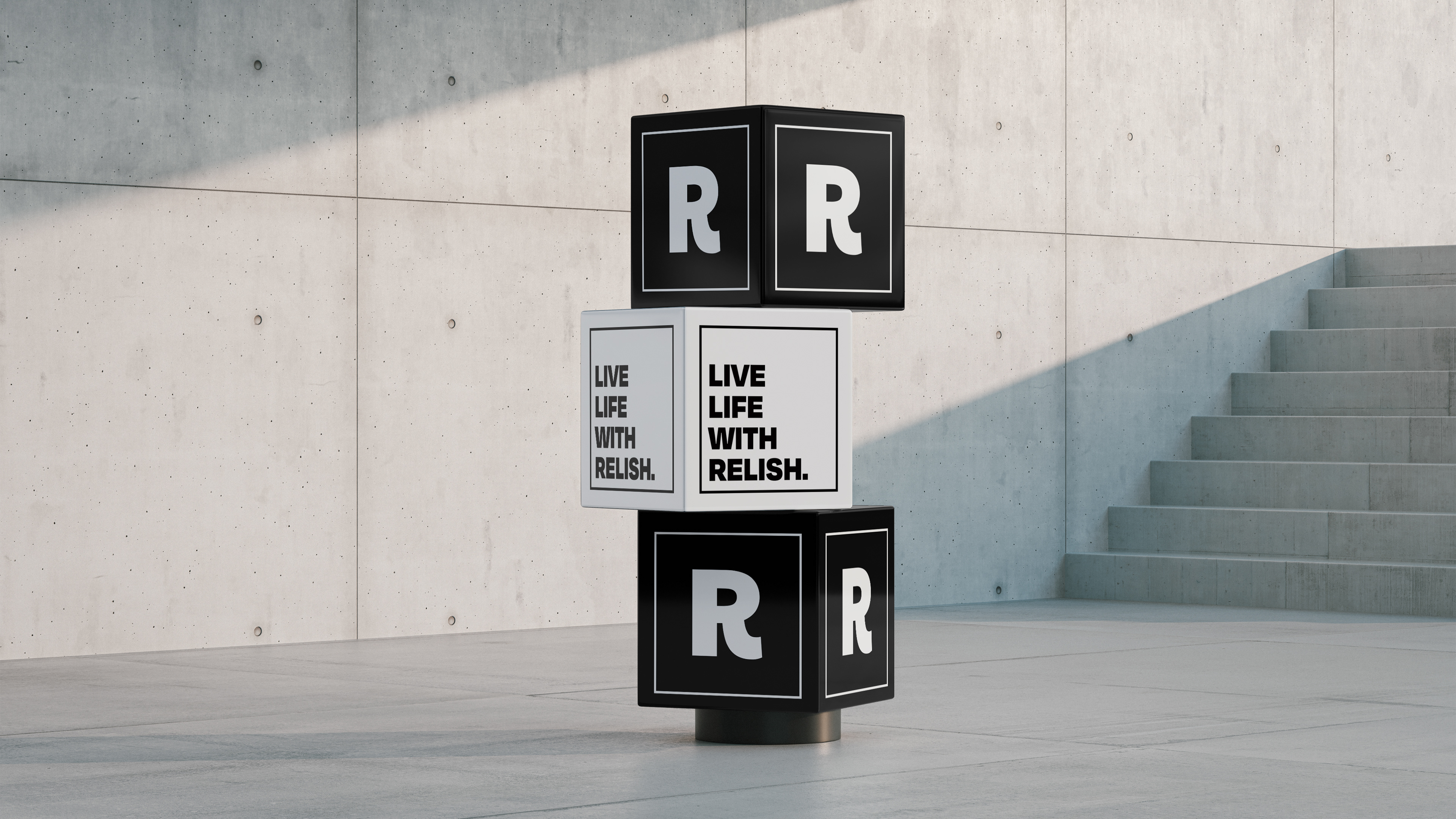 The visual identity is built around a modular logo system composed of square blocks. This flexible structure allows the logo to shift, rearrange, and adapt across different formats, reflecting the dynamic nature of the brand and its content. The system reinforces Relish as an evolving platform, one that stays cohesive and recognizable while seamlessly adapting to the rhythms of everyday life.